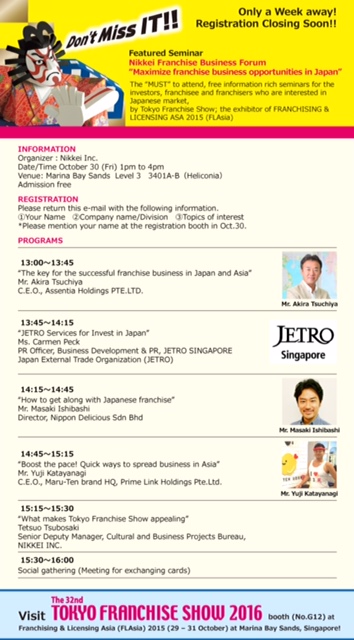 来たる2015年10月30日にシンガポールで開催されるアジア最大のフランチャイズショーFLAsiaで代表の土屋が講演します!